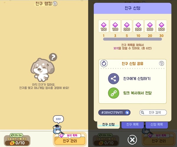 친구 기능도 그렇다. 미니게임천국의 친구 시스템은 자신의 친구 링크를 실제 지인에게 공유해서 친구를 맺는 방식이다. 예전 카카오톡으로 애니팡 하트를 주고받고 점수로 경쟁하던 그 시절을 연상케 한다. 솔직히 한물 간 시스템이라는 인상을 지울 수 없다.