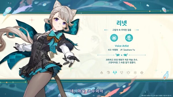 이명화 성우가 한국 더빙을 맡은 리넷은 '깜짝 고양이 모자'가 주 스킬이다. 깜짝 고양이 모자는 지속적으로 주변의 적을 도발하고 주기적으로 주변 적에게 바람 원소 피해를 준다. 깜짝 고양이 모자가 물, 불, 얼음, 번개 원소와 접촉할 경우 그에 상응하는 원소 속성을 획득하고 주기적으로 주변 적에게 리본탄을 추가로 발사해 원소 피해를 준다.