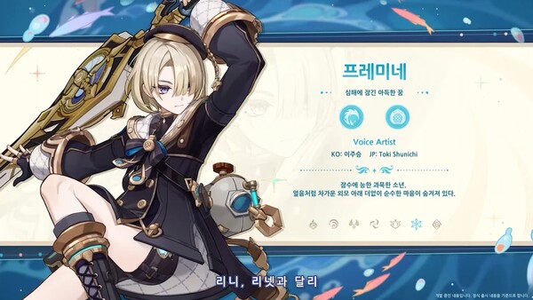 리니, 리넷과 함께 4.0 버전에서 등장하는 신규 캐릭터 '프레미네'는 내성적인 성격을 가진 뛰어난 잠수부다. 한국 더빙은 이주승 성우가 맡았다. 주 스킬은 '페어 카운트'다. 페어 카운트 상태에서 프레미네가 일반 공격을 진행하면 페어 카운트의 압력 단계를 증가시키고 얼음 서리를 발동해 얼음 원소 피해를 준다.