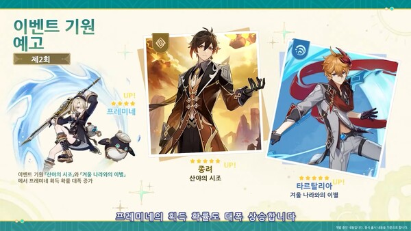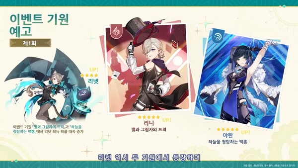 류웨이 대표와 루오하오는 이벤트 기원 정보를 알아봤다. 4.0 버전 전반부 기원에서 5성 캐릭터는 리니와 함께 '야란'이 복각한다. 4성 캐릭터로는 리넷이 등장할 예정이다. 신규 무기는 '최초의 대마술(활)'이 공개됐다. 후반부 기원에서는 5성 캐릭터로 종려와 타르탈리아가 복각하고 4성 캐릭터로 프레미네가 등장한다.