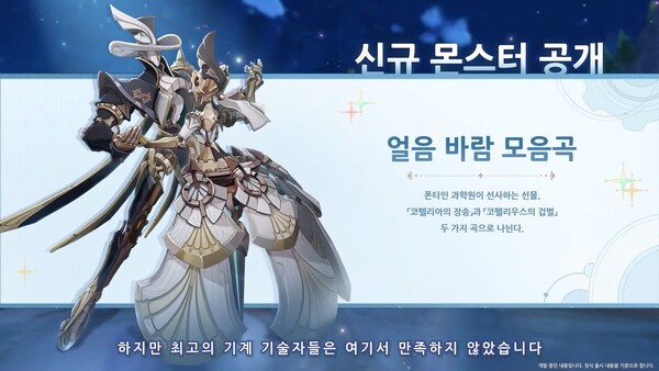 이는 곧 신규 몬스터로 이어진다. 눈서리 디자이너가 처음 공개한 폰타인 몬스터는 코펠리아와 코펠리우스다. 태엽 장치로 만들어진 무용수 몬스터로 피겨스케이트를 타는 듯한 모션이 인상적이다. 기계 기술자 마이아르데가 프로젝트를 이어받은 후 전투용 로봇으로 개조됐다는 설정이다.