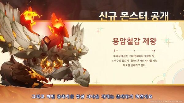 폰타인 수중에서는 신규 몬스터로 '용암철갑 제왕'을 만날 수 있다. 바위굴에 사는 고대 원류바다 이종의 왕으로 등에 작은 화산을 보유한 모습이 특징이다. 눈서리 디자이너는 "이 몬스터는 매우 사납고 흉포하다. 공격도 매우 강력하다. 등에 달린 작은 화산으로 불덩이를 발사한다"고 설명했다.