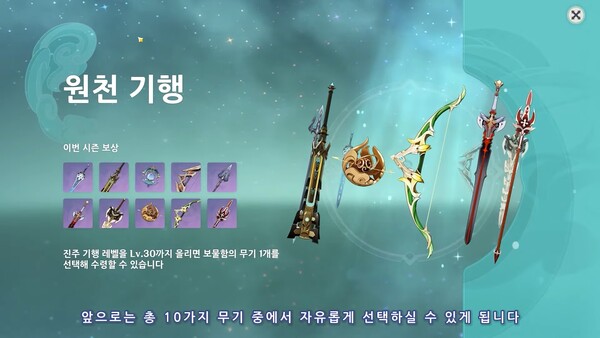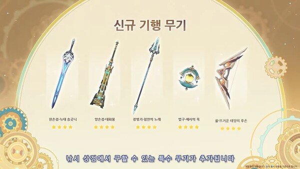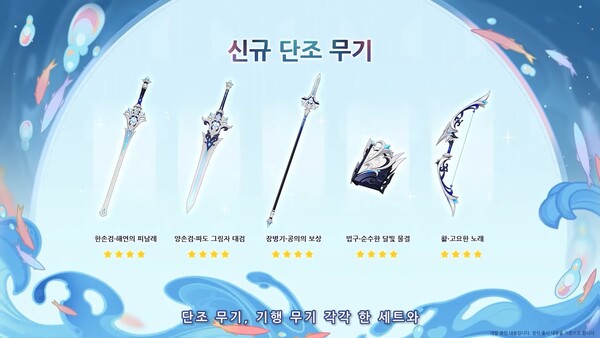 낚시 상점에서는 '잿빛의 강 뱃사공(한손검)'을 얻을 수 있다. 5종의 단조 무기 도면은 폰타인성 대장간 '에스타블레'에게서 교환할 수 있다. 5종의 기행 무기는 30레벨 기행 보상 상자에 추가될 예정이다. 기존 기행 무기는 그대로 유지되므로 총 10개의 무기 중 자유롭게 선택할 수 있다.