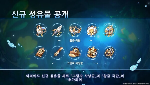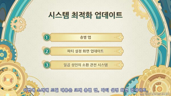 성유물에서는 그림자 사냥꾼과 황금 극단 세트가 추가된다. 해당 성유물 세트는 신규 축성 비경 '최업의 종말'에서 획득 가능하다. 류웨이 대표는 시스템 개선이 있는지도 물었다. 보보 디자이너는 시스템 최적화 업데이트로 층별 맵, 파티 설정 화면, 일곱 성인의 소환 관전 시스템을 예고했다.