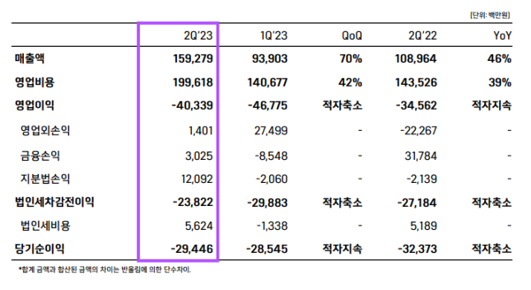 위메이드는 연결 재무제표 기준 올해 2분기 매출 1593억 원, 영업손실 1996억 원, 당기순손실 294억 원을 기록했다. 2분기 매출은 전년 동기 대비 46% 증가했지만 영업이익과 당기순이익은 적자를 지속했다.