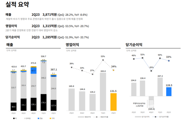 한편, 크래프톤은 2023년 2분기 매출 3871억 원, 영업이익 1315억 원, 당기순이익 1285억 원을 달성했다. 매출과 영역이익은 전년 동기 대비 각각 8.6%, 20.7% 감소했고 전 분기 대비 각각 28.2%, 53.5% 감소했다. 당기순이익은 전년 동기 대비 33.7%, 전 분기 대비 51.9% 감소한 기록이다.