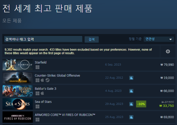 스타필드는 지난 3일 출시된 이래 전 세계를 호령한 라리안 스튜디오의 '발더스게이트3', 프롬소프트의 신작 '아머드 코어6 그리고 메타크리틱 89점을 받으며 JRPG계 반향을 일으킨 '씨 오브 스타즈' 등 굵직한 타이틀 모두를 출시하기도 전에 눌렀다.