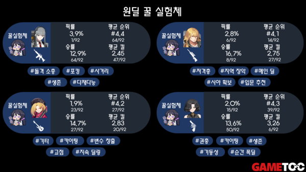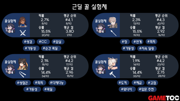 1순위로 바라보는 통계는 픽률입니다. 유저들 선택을 많이 받는다는 점은 성능이 이미 검증된 셈이죠. 다만 픽률이 높아도 이외 통계가 너무 처참할 경우 제외했습니다. 현 시점 OP 실험체를 확인해 보겠습니다.
