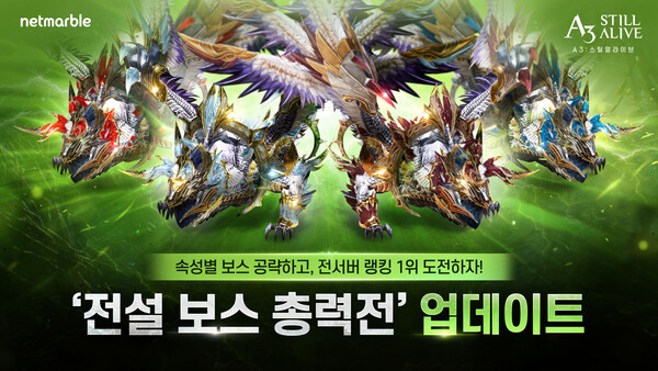 넷마블(대표 권영식, 도기욱)은 모바일 배틀로얄 MMORPG A3: 스틸얼라이브에 신규 콘텐츠 ‘전설 보스 총력전’을 추가하는 등 업데이트를 실시했다고 8일 밝혔다.
