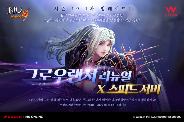 웹젠은 19일 ‘뮤 온라인’의 여성 캐릭터 '그로우랜서'의 업데이트를 적용하고, 해당 캐릭터를 가장 빠르게 육성할 수 있는 ‘스피드 서버’를 운영한다.