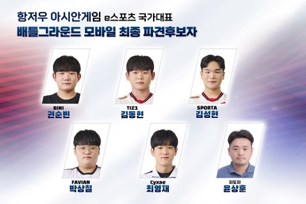 배틀그라운드 모바일 한국 대표팀으로 덕산 이스포츠 '비니' 권순빈, 농심 레드포스 '티지' 김동현, 농심 레드포스 '스포르타' 김성현, 디플러스 기아 '파비안' 박상철, 오버시스템 투제트 '씨재' 최영재 선수가 최종 선발됐다.