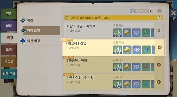 영역 토벌의 비경 입구는 특정 선행 임무를 완료해야 해금된다. 개발진은 최고의 최험을 위해 상응하는 스토리 임무를 먼저 완료하길 권장했다. 다만 북풍의 왕랑 울프의 영주는 해당 기능으로 도전할 수 없다.
