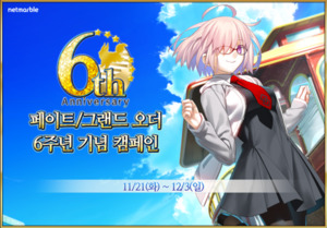 넷마블은 페이트/그랜드 오더 6주년 특설 사이트를 공개하고, 티켓 증정 이벤트를 10월 27일부터 11월 15일까지 진행한다. 특설 사이트 내 이벤트 페이지에서 휴대폰 번호, 유저 ID를 인증하고 응모하면 추첨을 통해 ‘AGF 2023 입장권’과 ‘메인 스테이지 관람권’ , ‘6주년 오리지널 무릎 담요’를 500명에게 증정한다. 당첨자 발표는 페이트/그랜드 오더 6주년이 되는 11월 21일 공개한다.