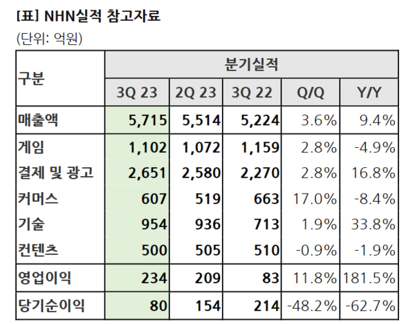 NHN(대표 정우진)이 2023년 3분기 실적을 9일 발표했다. 전체적으로 안정적인 성장세를 보인 가운데 결제와 광고 부문이 눈에 띄게 호조를 보였다.