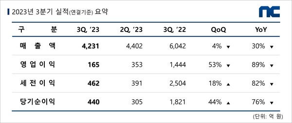 엔씨소프트(대표 김택진)가 2023년 3분기 실적 결산 결과 연결기준 매출 4231억 원, 영업이익 165억 원, 당기순이익 440억 원을 기록했다.