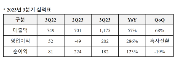 네오위즈의 3분기 매출은 1175억 원, 영업이익 202억 원을 기록했다. 전년 동기 대비 각각 57%, 286% 증가한 수치다. 당기순이익은 182억 원으로 전년 동기대비 123% 성장했다.