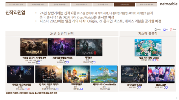 넷마블은 지스타 2023에 출품하는 '일곱 개의 대죄: Origin'과 'RF 온라인 넥스트', '데미스 리본' 3종의 2024년 하반기 출시를 예고했다.