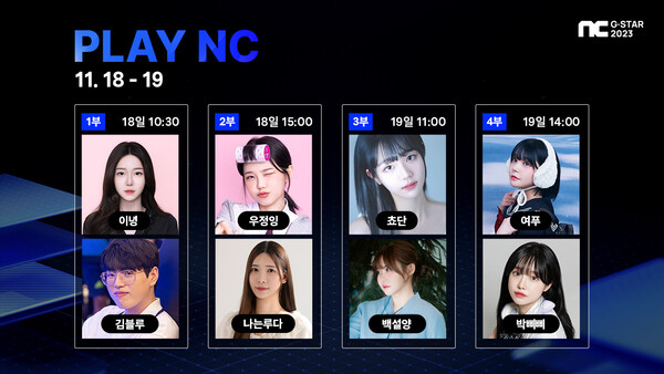 19일에는 오전 11시부터 PLAY NC가 시작된다. MC ‘정소림’, 캐스터 ‘최광원’, 인플루언서 ‘쵸단’과 ‘백설양’이 3부를 책임진다. 마지막 4부에서는 MC ‘김효진’, 캐스터 ‘박상현’, 인플루언서 ‘여푸’, ‘박삐삐’가 참가해 오후 2시부터 행사를 이끌 예정이다.