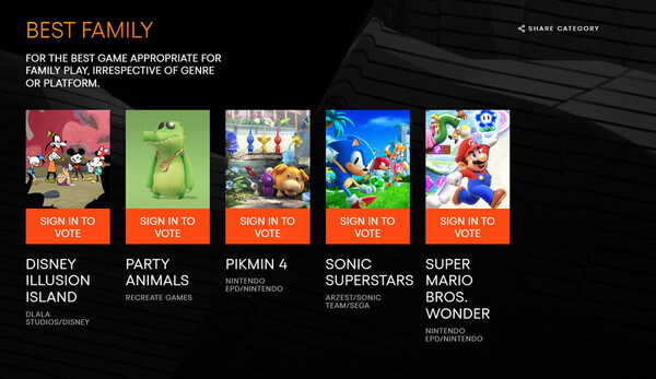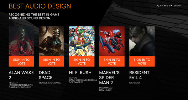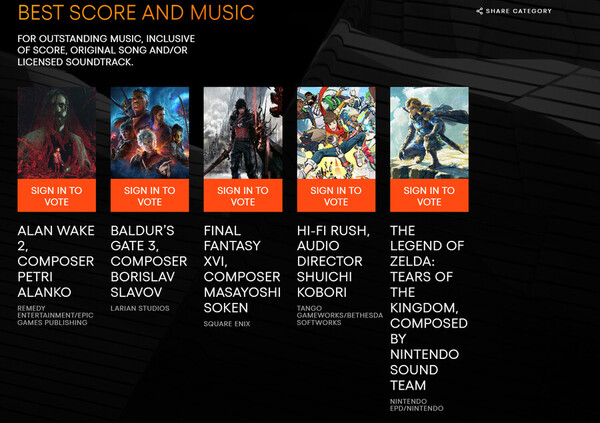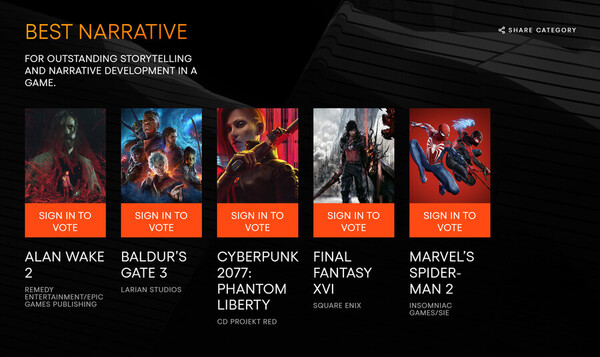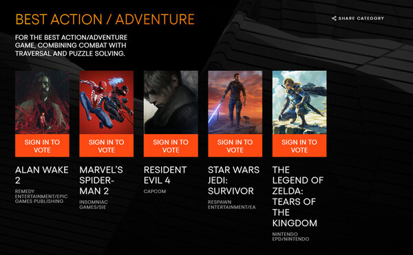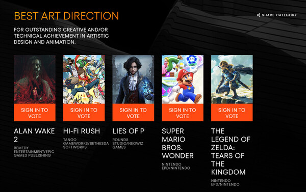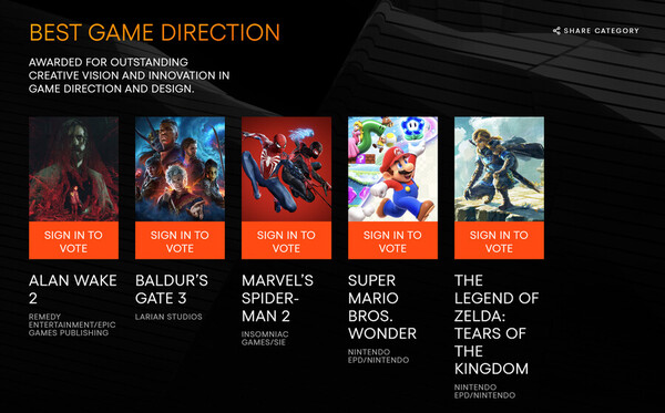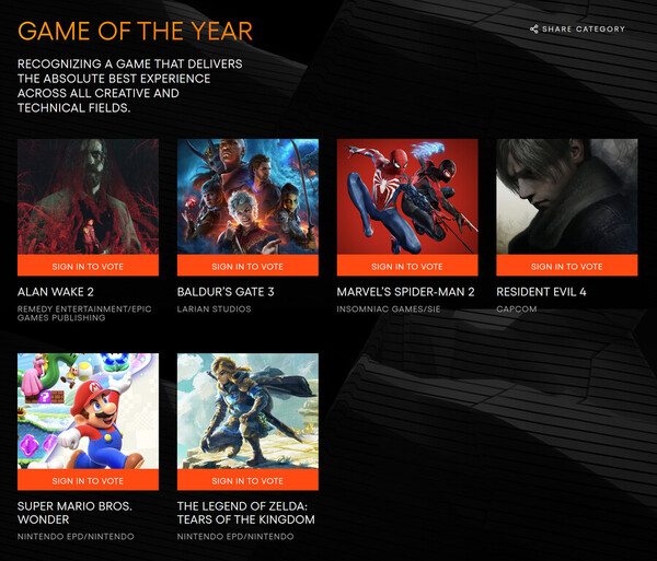 올해의 게임 후보작으로는 '앨런 웨이크 2', '발더스 게이트 3', '마블 스파이더맨 2', '바이오하자드 4 리메이크', '슈퍼 마리오 브라더스 원더', '젤다의 전설 왕국의 눈물'이 쟁쟁한 리스트에 포함됐다.