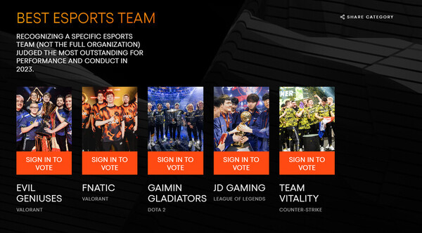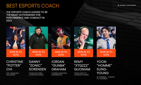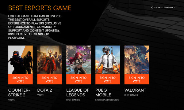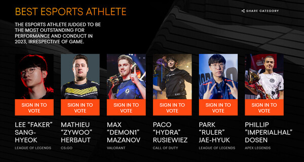 최고의 e스포츠 선수 후보도 주목할 만하다. 발로란트, 에이펙스 레전드, 카운터 스트라이크 글로벌 오펜시브에서는 모두 외국인 선수가 등록됐지만 리그 오브 레전드에서는 T1 '페이커' 이상혁, 징동 게이밍 '룰러' 박재혁이 후보에 올랐다. 19일 LoL 월드 챔피언십 결승전에서 T1이 우승컵을 거머쥔다면 페이커의 수상도 유력할 전망이다.