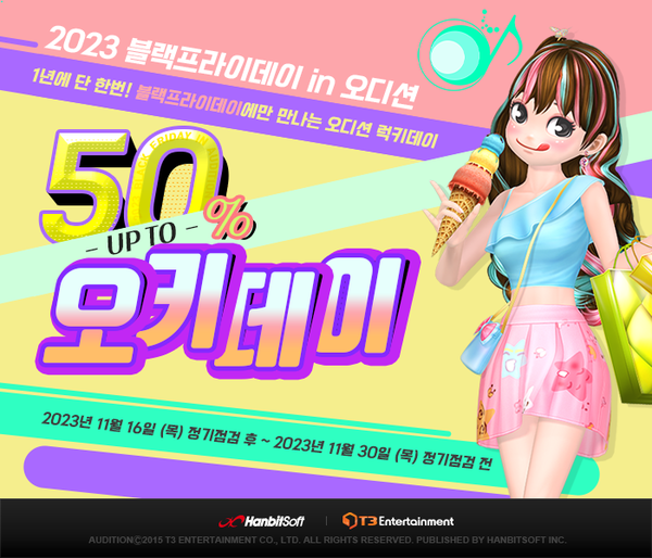 한빛소프트는 리듬댄스 게임 '오디션'에서 블랙프라이데이 시즌을 맞아 유저들에게 감사하는 마음을 담은 초특급 프로모션을 전개한다.