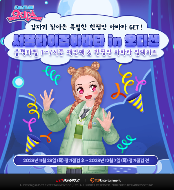 23일부터 12월 7일 점검 전까지 '서프라이즈 in 오디션' 이벤트를 전개한다. 이벤트 기간 중 블랙라벨 시즌1(2016년)~시즌7(2022년) 아바타 전 품목을 선보인다. 블랙라벨 아바타는 매년 특정 기간에만 등장하는 한정판 세트 의상이다.