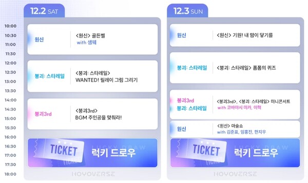 메인 무대에서는 원신 골든벨, 붕괴 스타레일 원티드 릴레이 그림 그리기, 붕괴3rd BGM 주인공 찾기, 럭키 드로우가 토요일에 진행되며 일요일에는 원신 기원 내 마음이 닿기를, 붕괴 스타레일 폼폼의 퀴즈, 붕괴3rd·스타레일 미니 콘서트, 원신 마술쇼, 럭키 드로우가 진행될 예정이다.