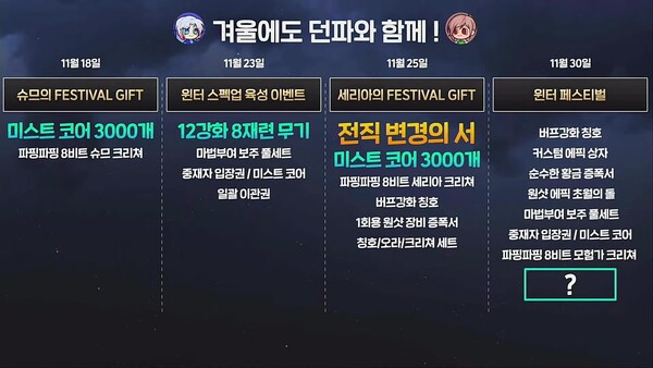 이번 업데이트 정말 많이 준비했다. 기대해도 좋다. 양질의 콘텐츠로 보답하겠다. 열심히 한다는 말은 너무 많이 했다. 이제는 잘 하겠다. 그동안 노하우가 너무 부족했다. 지금은 보완하기 위한 빌드업을 완료했다. 던전앤파이터를 향한 신뢰를 회복할 시간이다. 선계와 내년부터는 분명 나은 모습 보여줄 수 있을 것이니 많은 관심 부탁한다.