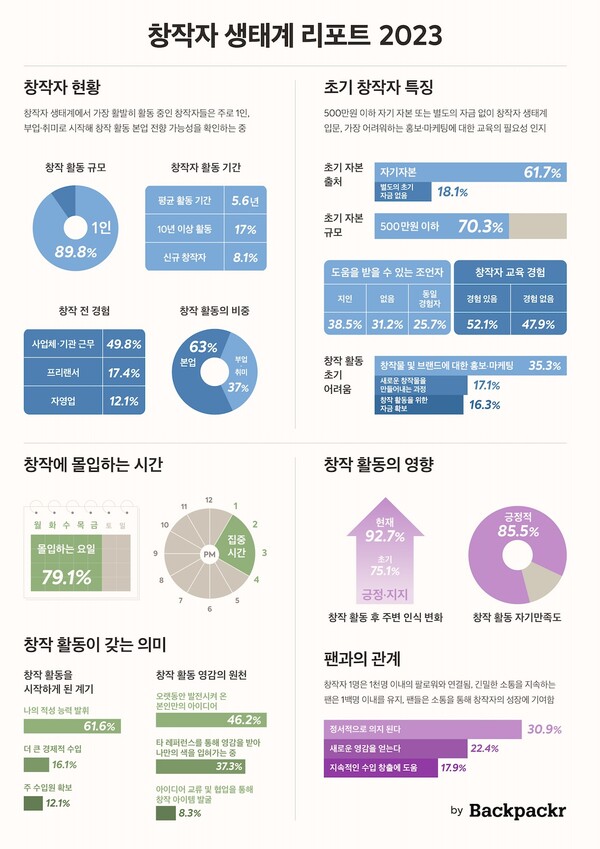 창작자 생태계 리포트는 아이디어스, 텀블벅, 스테디오에서 활동하는 입점 창작자 7만여 명의 행태를 분석하고 활동 지수 상위 10% 창작자 1000명을 대상으로 실시한 설문 조사를 바탕으로 제작했다. 매년 12월 백패커 공식 홈페이지에서 정기적으로 발행될 예정이다.