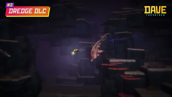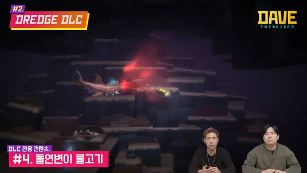 인트로를 마친 그들은 드렛지와의 컬래버레이션을 소개했다. 데이브 더 다이버의 최초 컬래버레이션 DLC다. 드렛지는 2023년 최고의 낚시 게임으로 뽑힌 게임이다. 공개된 트레일러에서는 지금껏 데이브 더 다이버에서 보지 못했던 음산한 분위기가 인상적이었다.