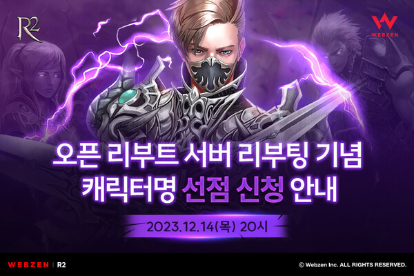 웹젠은 14일 저녁부터 오는 18일 자정까지 약 나흘간 오픈 리부트 서버 리부팅을 기념한 캐릭터명 사전 신청 이벤트를 실시한다. 이벤트 기간에 ‘R2’ 계정에 로그인 후 안내 페이지의 ‘캐릭터명 선점하기’를 눌러 이벤트에 참여할 수 있다. 캐릭터명 선점 신청은 계정당 1회, 캐릭터 1개에 한해 가능하며 신청 후에는 수정이 불가능하다.