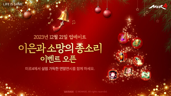 위메이드(대표 장현국)는 미르4에서 풍성한 아이템을 선물하는 연말연시 이벤트 ‘이은과 소망의 종소리’를 21일 시작했다.