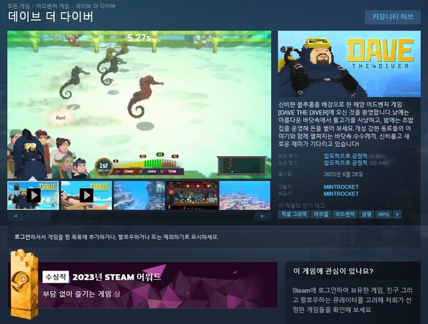 넥슨 민트로켓 '데이브 더 다이버'가 2023 스팀 어워드 '부담 없이 즐기는 게임상'을 받았다. 2018년 크래프톤 'PUBG 배틀그라운드' 이후 5년 만에 한국 게임이 이름을 올린 만큼 그 의미가 남다르다.