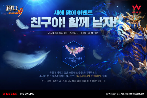 연초 신규 회원 및 복귀회원을 위한 초청 이벤트로 ‘친구야 함께 날자’를 진행한다. 기존 게임 회원들은 작년 12월 18일부터 31일까지 접속 기록이 없거나 올해 1월 1일 이후 신규 가입한 회원들을 초청할 수 있다.