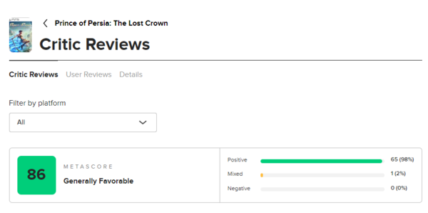 TheGamer [80] 스토리와 캐릭터가 엄청나게 매력적이지는 않지만, 플랫포머 전투로 시리즈의 새로운 정점을 찍었다. 이 게임은 시리즈 최고의 작품일 뿐만 아니라, 페르시아의 왕자 시리즈가 어째서 위대한지 이해할 수 있는 작품이다.