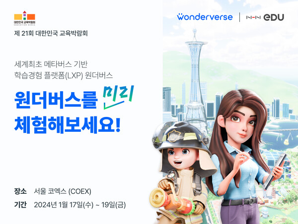 NHN에듀(대표 여원동)는 ‘2024 대한민국 교육박람회’에서 세계 최초 메타버스 학습경험 플랫폼인 ‘원더버스’ 체험 공간을 운영한다고 16일 밝혔다. 교육박람회는 오는 1월 17일부터 19일까지 코엑스에서 개최된다.