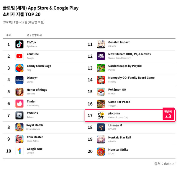 2023년 상반기에 이어 data.ai(데이터에이아이)가 집계한 ‘2023 모바일 앱 마켓 (App market, Android+iOS 합산) 소비자 지출’ 순위에서도 게임을 포함한 전체 카테고리 ‘일본 1위’, ‘글로벌 17위(게임 앱 제외시 7위)’에 올랐다.