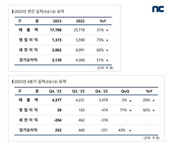 엔씨소프트(대표 김택진)가 2023년 4분기 및 연간 실적(연결기준)을 발표했다.