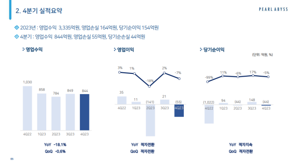 펄어비스의 2023년 영업수익은 3335억 원으로 전년 대비 13.5% 감소했으며, 영업손실은 164억 원으로 적자전환했다. 당기순이익은 154억 원으로 전년대비 흑자전환했다. 4분기 영업수익은 844억 원으로 전분기 대비 0.6% 감소했으며, 영업손실 및 당기순손실은 각각 55억 원, 44억 원으로 적자전환했다.
