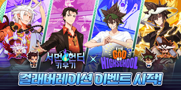 '갓 오브 하이스쿨'과의 제휴로 1차와 2차에 걸쳐 각각 2명의 캐릭터가 각성 전후 버전의 동료와 코스튬으로 게임에 합류할 예정이다. 21일 1차 업데이트에서는 원작의 주인공 ‘진모리’와 최종 보스 박무진이 ‘서먼헌터 키우기'의 신규 코스튬 4종 및 동료 2종으로 등장한다.