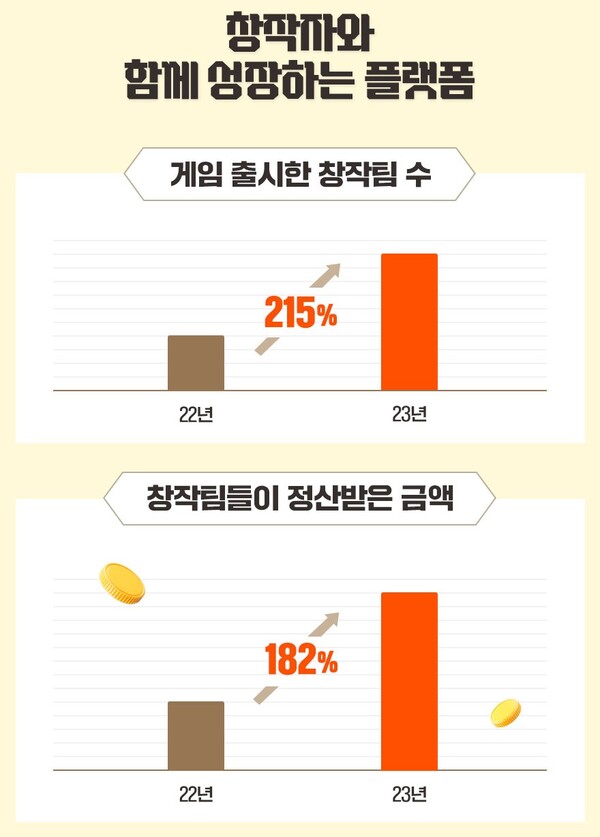 스토브인디의 입점을 희망하는 개발사도 늘어났다. 23년 스토브인디를 통해 게임을 출시한 창작팀은 22년 대비 215% 증가했다. 창작팀들이 받은 정산 금액 또한 두 배 가까이 늘어났다.
