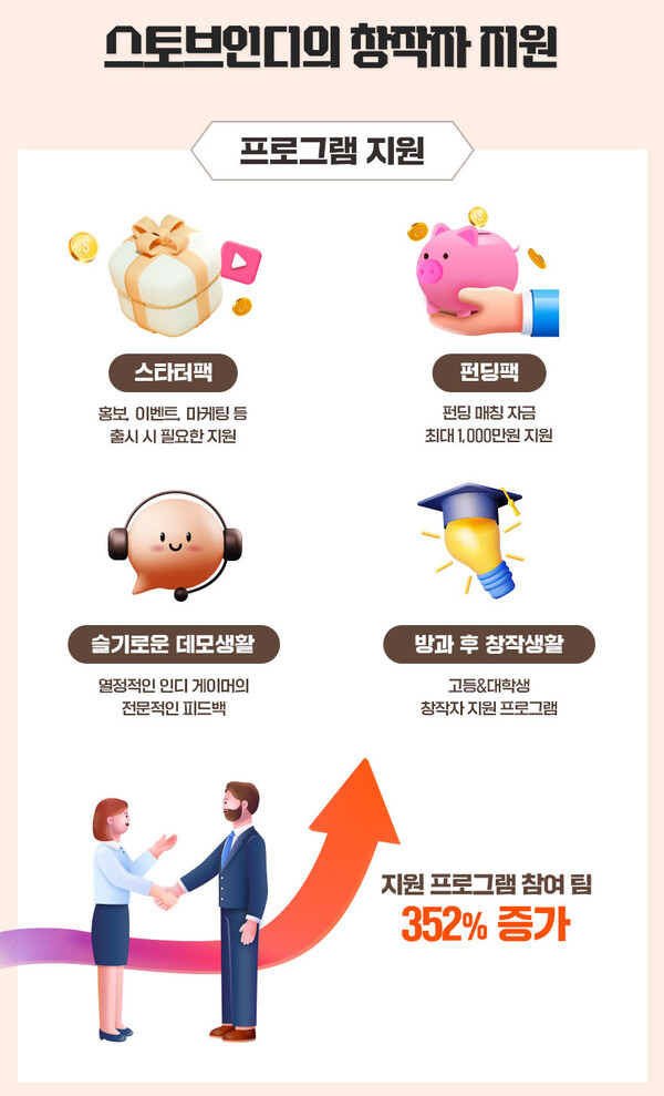 스토브인디가 창작자와 함께 성장할 수 있었던 것은 다양한 창작자 지원 프로그램이 밑받침되었기 때문이다. 스스토브인디는 크라우드 펀딩을 준비 중인 개발사를 지원하는 ‘펀딩팩’, 유저들의 피드백이 필요한 개발사를 위한 ‘슬기로운 데모생활’ 등 다양한 인디 게임 창작 지원 프로그램을 운영 중이다.