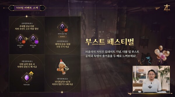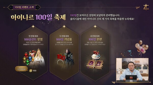 100솔란트 상점, 축하 모션과 머리띠 배포, 100일 우편 선물 등을 준비 중이다. 파올라의 감사 편지는 기존 협력 던전 플레이 기록에 따라 차원의 영혼석을 깜짝 선물하는 이벤트로, 산정 기간은 3월 13일까지다.