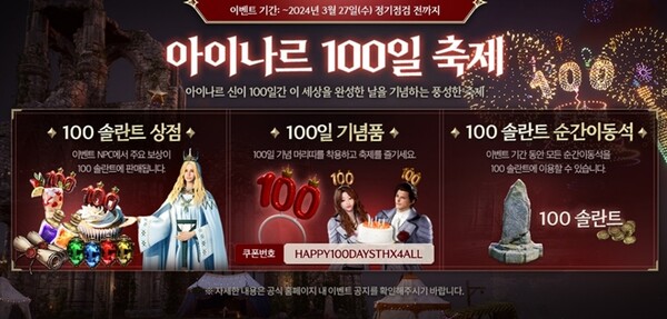 정식 서비스 100일을 맞이해 아이나르 100일 축제가 개최됐다. 축제 기간 동안 100솔란트로 다양한 상품을 구매할 수 있으며, 모든 순간이동석을 100솔란트에 이용할 수 있다. 구매한 보석으로는 진귀한 성장석·단련서·연마서 제작이 가능하다. 100일 기념 출석부 이벤트도 진행된다.