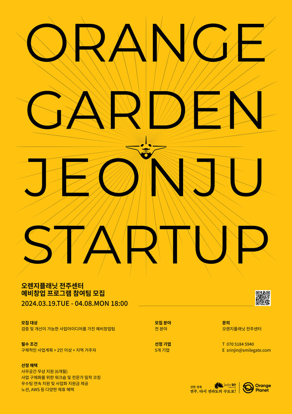 스마일게이트 오렌지플래닛 창업재단(센터장 서상봉) 전주센터가 예비창업자 지원프로그램 ‘오렌지가든’에 참여할 팀을 모집한다.