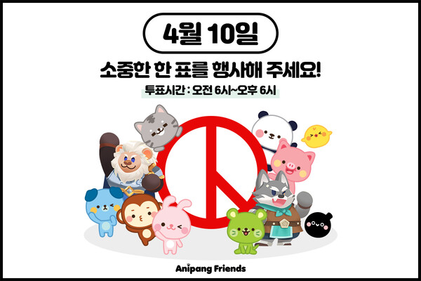 22대 국회의원 선거는 4월 10일, 오전 6시부터 오후 6시까지 진행된다. ‘애니팡 프렌즈’의 응원은 ‘애니팡1~4’ 등 오리지널 애니팡 시리즈와 ‘상하이 애니팡’, 자회사 플레이링스의 ‘애니팡 맞고’에서 만날 수 있다.