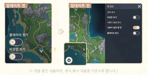 4.6 버전 업데이트 이후 맵 → 설정 화면에서 비경, 플레이어, 사용자 설정 맵 핀 등 맵 아이콘 표시 여부를 설정할 수 있다. 또한 맵을 보다 쉽게 확인할 수 있도록 디스플레이가 간소화될 예정이다.