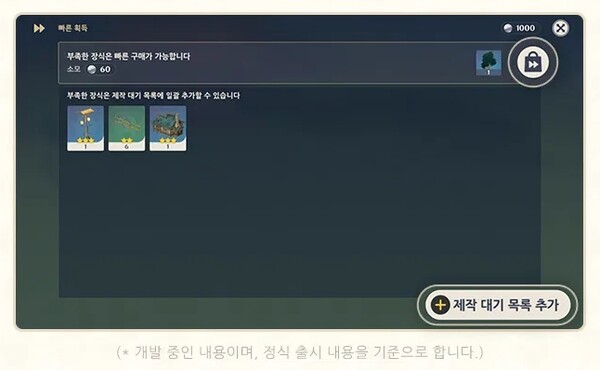 ② 부족하지만 제작 가능한 장식은 '포롱이 → 장식 제작' 화면에서 제작 대기 목록에 추가할 수 있다. 제작 대기 목록에 있는 장식은 일괄적으로 제작 대기열에 추가해서 제작할 수 있다.