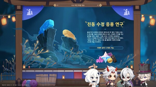 새로운 진동 수정 응용 연구도 진행된다. 여러 진동 수정을 연결해 영사 반응으로 획득하는 효과다. 해당 이벤트 도전에는 2개의 파티가 필요하다. 전투 시작 전 두 파티의 진동 수정 영사 플랜을 설정하면 울림 수정과 응답 수정을 조합해 다양한 전투 버프 효과를 획득할 수 있다.