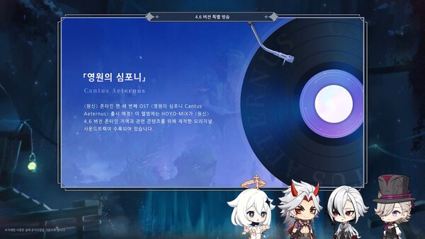 원신 폰타인 편 세 번째 OST '영원의 심포니 Cantus Aeternus'가 출시된다. 해당 앨범에는 HoYo-MiX가 원신 4.6 버전 폰타인 지역과 관련 콘텐츠를 위해 제작한 오리지널 사운드트랙이 수록되어 있다.